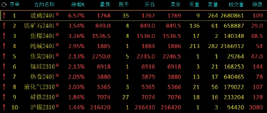 午盤收盤,國內(nèi)期貨主力合約多數(shù)上漲,玻璃(1789, 25.00, 1.42%)漲超6%,鐵礦(846, 4.50, 0.53%)、焦煤(1593, 64.50, 4.22%)漲超3%,純堿漲近3%,錳硅(6946, 52.00, 0.75%)、液化石油氣(LPG)、熱卷(3903, 47.00, 1.22%)、焦炭(2297, 60.50, 2.71%)漲超2%。跌幅方面,蘋果(8807, -42.00, -0.47%)跌近2%,集運指數(shù)(歐線)跌超1%。