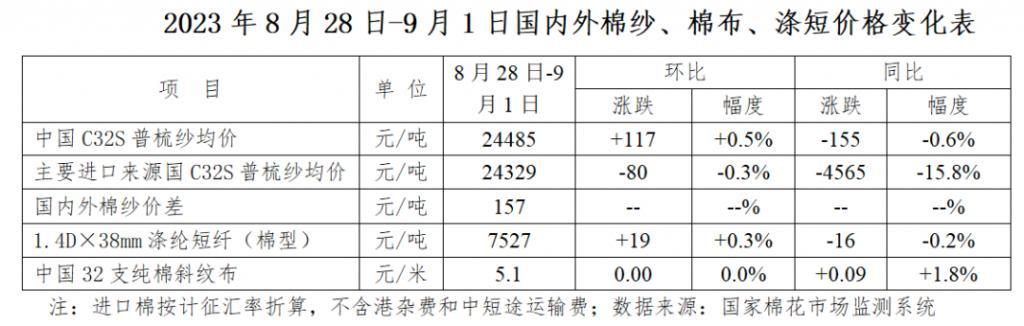 美國棉區(qū)遭遇颶風,引發(fā)市場對供應方面的擔憂,疊加國際油價上漲和美元疲軟等因素,國際棉花價格小幅上漲。2023年8月28日-9月1日,紐約棉花期貨主力合約結(jié)算均價87.37美分/磅,較前周上漲1.91美分/磅,漲幅2.2%;代表進口棉中國主港到岸均價的國際棉花指數(shù)(M)均價98.49美分/磅,較前周上漲2.58美分/磅,漲幅2.7%;折人民幣進口成本17111元/噸(按1%關(guān)稅計算,含港雜和運費),較前周上漲471元/噸,漲幅2.8%。國內(nèi)棉價比國際棉價高1008元/噸,價差較前周縮窄285元/噸。