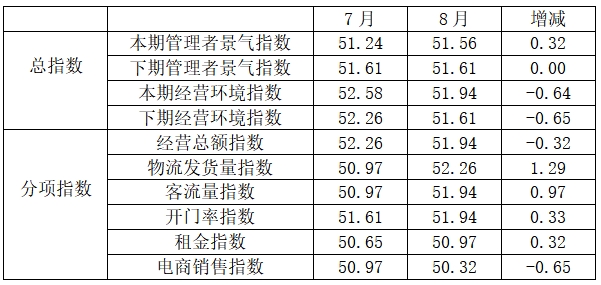 數(shù)據(jù)顯示,管理者方面,下期管理者景氣指數(shù)為51.61,比7月持平;下期經(jīng)營環(huán)境指數(shù)為51.61,比7月的52.26下降0.65個(gè)百分點(diǎn)。商戶方面,下期商戶景氣指數(shù)為52.47,比7月的53.81下降1.34個(gè)百分點(diǎn);下期經(jīng)營環(huán)境指數(shù)為52.47,比7月的53.67下降1.20個(gè)百分點(diǎn)。