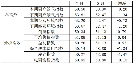 從商戶景氣指數(shù)來看,總指數(shù)中,8月商戶景氣指數(shù)為50.30,比7月的50.50下降0.20個(gè)百分點(diǎn);經(jīng)營環(huán)境指數(shù)為52.47,比7月的53.20下降0.73個(gè)百分點(diǎn)。