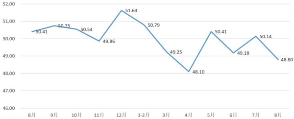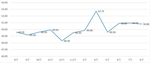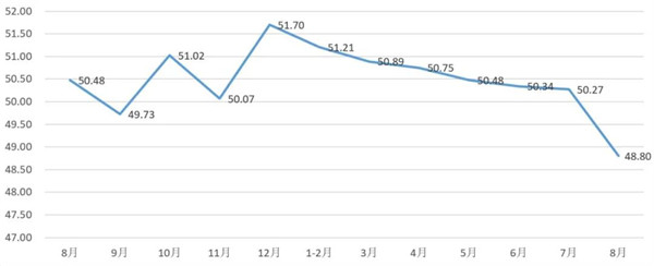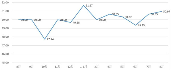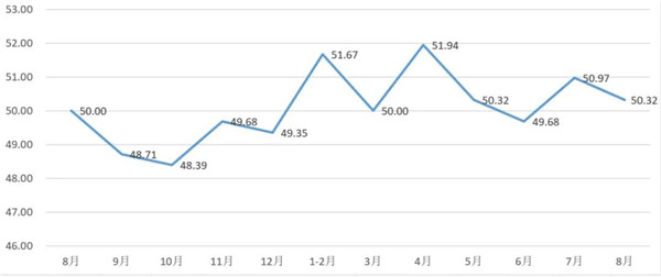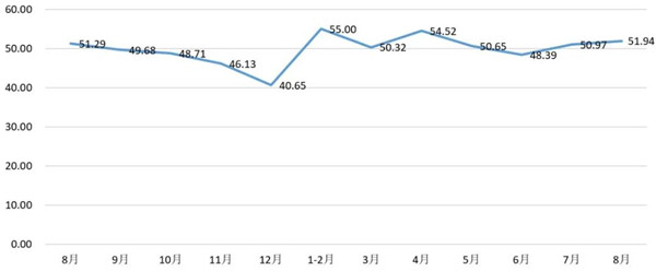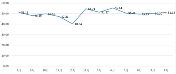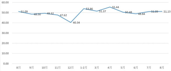分項(xiàng)指數(shù)中,銷量指數(shù)為51.13,比7月的50.34上升0.79個(gè)百分點(diǎn);平均售價(jià)指數(shù)為51.13,比7月的51.09上升0.04個(gè)百分點(diǎn);盈利指數(shù)為51.13,比7月的50.20上升0.93個(gè)百分點(diǎn);綜合成本費(fèi)用指數(shù)為48.80,比7月的50.14下降1.34個(gè)百分點(diǎn);庫存指數(shù)為48.80,比7月的50.27下降1.47個(gè)百分點(diǎn);電商銷售指數(shù)為50.80,比7月的50.95下降0.15個(gè)百分點(diǎn)。