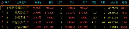 午盤(pán)收盤(pán),國(guó)內(nèi)期貨主力合約漲跌不一,集運(yùn)指數(shù)(歐線)漲超9%,瀝青(3910, 31.00, 0.80%)、焦煤(1709, -3.00, -0.18%)漲超2%,丁二烯橡膠(14215, 55.00, 0.39%)(BR)、滬錫(222230, 1240.00, 0.56%)、液化石油氣(LPG)漲超1%。跌幅方面,滬鉛(16745, 200.00, 1.21%)跌超2%,玻璃(1763, 0.00, 0.00%)、橡膠、棕櫚(7770, 30.00, 0.39%)油、工業(yè)硅、20號(hào)膠、滬銀、滬鋁(19045, 55.00, 0.29%)跌超1%。