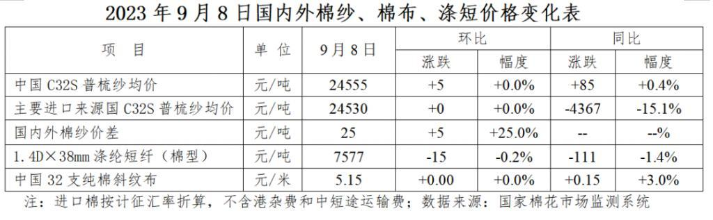 標(biāo)普全球數(shù)據(jù)顯示中國8月財新服務(wù)業(yè)PMI錄得51.8,為去年12月以來最低值,引發(fā)對全球經(jīng)濟增長放緩的擔(dān)憂;美國8月非制造業(yè)指數(shù)錄得54.5超預(yù)期走高,增加美聯(lián)儲在更長時間內(nèi)維持較高利率的預(yù)期,美股下跌及美元強勢上漲施壓大宗商品市場,國際棉花價格下跌。2023年9月7日,紐約棉花期貨主力合約結(jié)算價85.38美分/磅,較前周下跌4.57美分/磅,跌幅5.1%;9月8日,代表進口棉中國主港到岸均價的國際棉花指數(shù)(M)均價96.78美分/磅,較前周下跌1.93美分/磅,跌幅2.0%;折人民幣進口成本16909元/噸(按1%關(guān)稅計算,不含港雜和運費),較前周下跌337元/噸,跌幅2.0%。國內(nèi)棉價比國際棉價高1002元/噸,價差較前周擴大581元/噸。