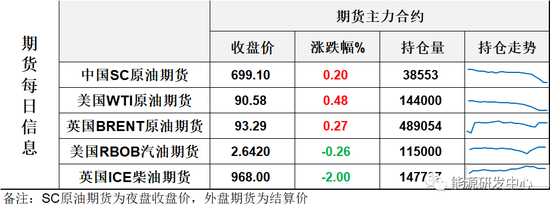 【1】WTI主力原油期貨收漲0.43美元,漲幅0.48%,報90.58美元/桶;布倫特主力原油期貨收漲0.25美元,漲幅0.27%,報93.29美元/桶;INE原油期貨收漲0.2%,報699.1元。