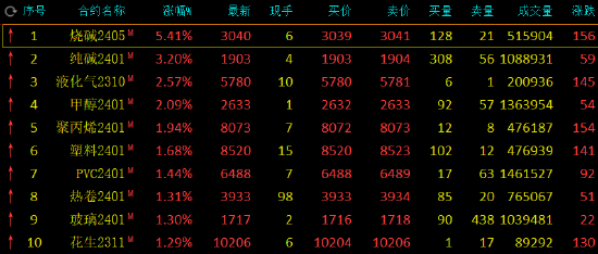 午盤(pán)收盤(pán),國(guó)內(nèi)期貨主力合約多數(shù)上漲,燒堿漲超5%,純堿漲超3%,液化石油氣(LPG)、甲醇(2590, -46.00, -1.75%)漲超2%。跌幅方面,碳酸鋰跌超5%,豆二、菜籽油、豆粕(3990, 18.00, 0.45%)跌超2%。
