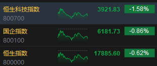 9月20日消息,港股三大指數(shù)集體收跌,截至收盤,恒生指數(shù)(17885.6, -111.57, -0.62%)跌0.62%,報17885.6點,恒生科技指數(shù)(3921.83, -62.96, -1.58%)跌1.58%,國企指數(shù)跌0.86%。盤面上,核心科技股普遍下跌,網(wǎng)易跌超3%,快手、美團跌超2%,百度集團、京東集團、騰訊控股(309.2, -3.20, -1.02%)跌超1%;汽車股跌幅明顯,蔚來跌近12%,小鵬汽車跌超5%;內(nèi)房股多數(shù)下跌,中國恒大(0.5, -0.05, -9.09%)跌超9%;影視股表現(xiàn)活躍,阿里影業(yè)(0.58, 0.03, 5.46%)收購大麥股價漲超5%;蘋果概念股全線走低,舜宇光學(xué)科技(58, -3.35, -5.46%)跌超5%;石油股逆勢上漲,中石油漲超1%;機械、燃?xì)?、保險等板塊飄紅。
