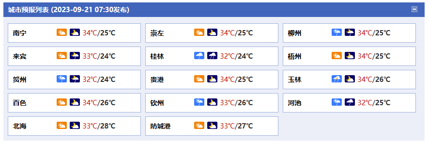23日白天到晚上,桂北和沿海多云有陣雨或雷雨、局地大雨,桂南多云有分散陣雨或雷雨。