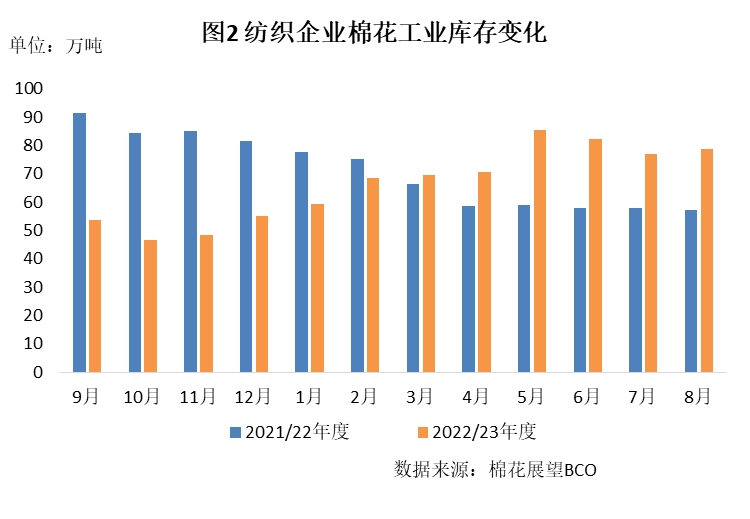 8月,紡織企業(yè)原料采購(gòu)來(lái)源豐富,紡織企業(yè)積極競(jìng)拍儲(chǔ)備棉,成交率為100%,現(xiàn)貨市場(chǎng)上企業(yè)也逢低進(jìn)貨,同時(shí)部分增加了進(jìn)口棉的采購(gòu),月內(nèi)紡企原料庫(kù)存總體有所增加。截至8月31日,紡織企業(yè)在庫(kù)棉花工業(yè)庫(kù)存量為78.84萬(wàn)噸,環(huán)比增加1.99萬(wàn)噸,同比增加21.52萬(wàn)噸。其中:27%的企業(yè)減少棉花庫(kù)存,38%增加庫(kù)存,45%基本保持不變。