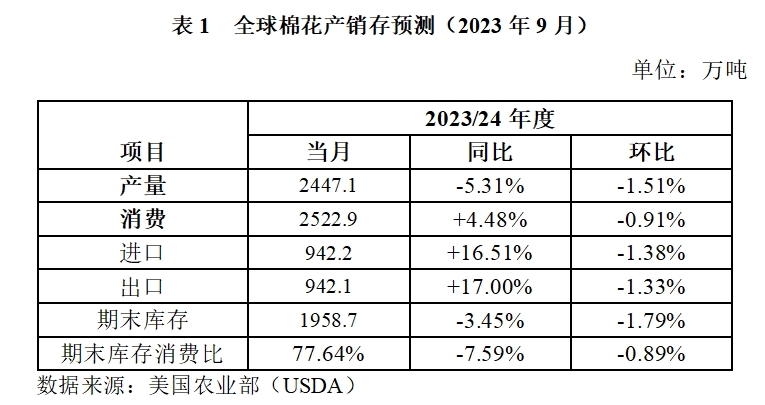據(jù)美國農(nóng)業(yè)部9月份數(shù)據(jù)預(yù)測,2023年度全球棉花產(chǎn)量2447萬噸,較上月調(diào)減38萬噸,減幅1.51%,同比減少137萬噸,減幅5.31%;消費量2523萬噸,較上月調(diào)減23萬噸,減幅0.91%,同比增加108萬噸,增幅4.48%;產(chǎn)需缺口擴(kuò)大至76萬噸。期末庫存消費比77.64%,較上月下降0.89個百分點,同比下降7.59個百分點。