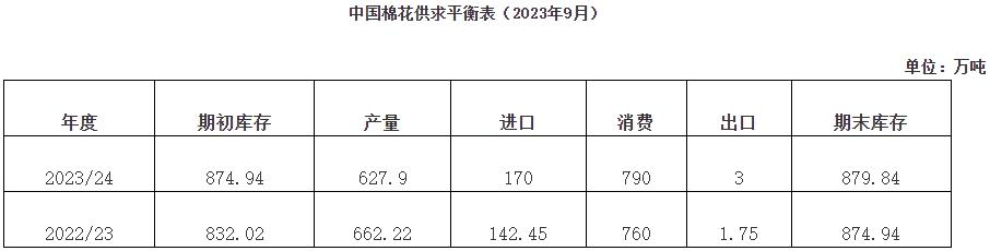 2023/24年度,隨著我國國民經(jīng)濟(jì)持續(xù)恢復(fù),棉花消費(fèi)將持續(xù)回升,據(jù)中國棉花協(xié)會(huì)預(yù)計(jì),2023/24年度我國棉花消費(fèi)量恢復(fù)至790萬噸,同比增長4%;產(chǎn)量約627.9萬噸,同比下降5.2%;進(jìn)口170萬噸,同比增長19.3%;期末庫存879.8萬噸,同比增長0.6%。