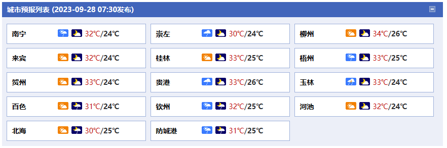 南寧市:今天白天多云有陣雨或雷雨,今天晚上多云、局地有陣雨或雷雨,東北風(fēng)1~2級,最高氣溫32℃,最低氣溫24℃。