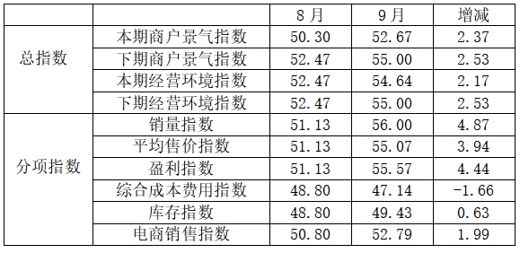 分項指數(shù)中,銷量指數(shù)為56.00,比8月的51.13上升4.87個百分點;平均售價指數(shù)為55.07,比8月的51.13上升3.94個百分點;盈利指數(shù)為55.57,比8月的51.13上升4.44個百分點;綜合成本費用指數(shù)為47.14,比8月的48.80下降1.66個百分點;庫存指數(shù)為49.43,比8月的48.80上升0.63個百分點;電商銷售指數(shù)為52.79,比8月的50.80上升1.99個百分點。