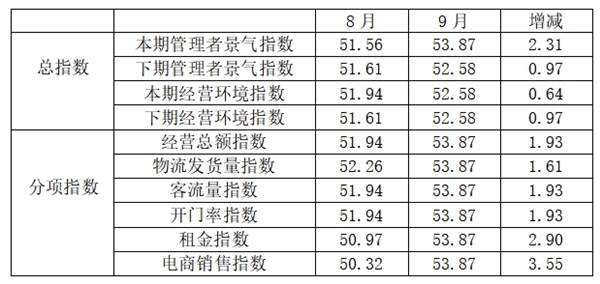 分項指數(shù)中,經(jīng)營總額指數(shù)為53.87,比8月的51.94上升1.93個百分點;物流發(fā)貨量指數(shù)為53.87,比8月的52.26上升1.61個百分點;客流量指數(shù)為53.87,比8月51.94上升1.93個百分點;開門率指數(shù)為53.87,比8月的51.94上升1.93個百分點;租金指數(shù)為53.87,比8月的50.97上升2.90個百分點;電商銷售指數(shù)為53.87,比8月的50.32上升3.55個百分點。