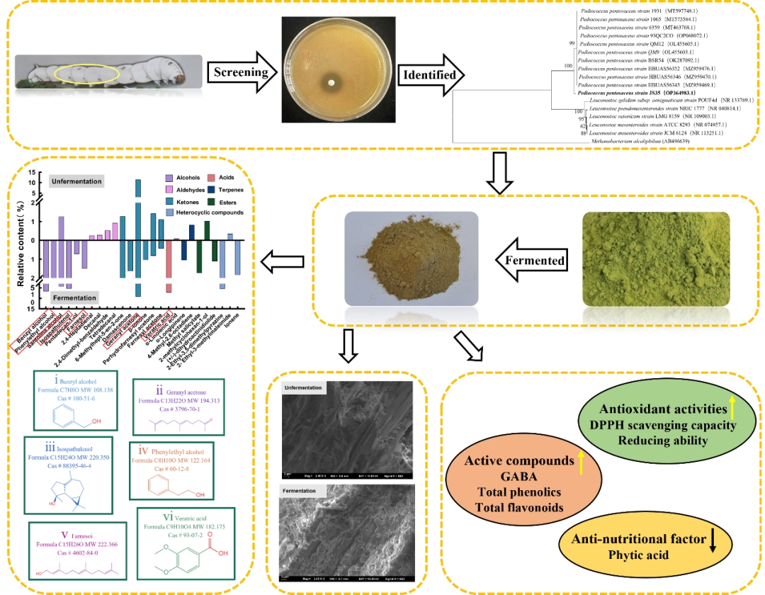 本研究采用一株篩選自家蠶腸道的乳酸菌發(fā)酵桑葉粉,一方面將活性成分γ-氨基丁酸(γ-aminobutyric acid,GABA)的含量提高了951.3%,同時有效降低桑葉中草青味的主要成分香葉基丙酮的相對含量,并顯著提高花香、果香等宜人香氣成分苯甲醇、苯乙醇、金合歡醇等含量。