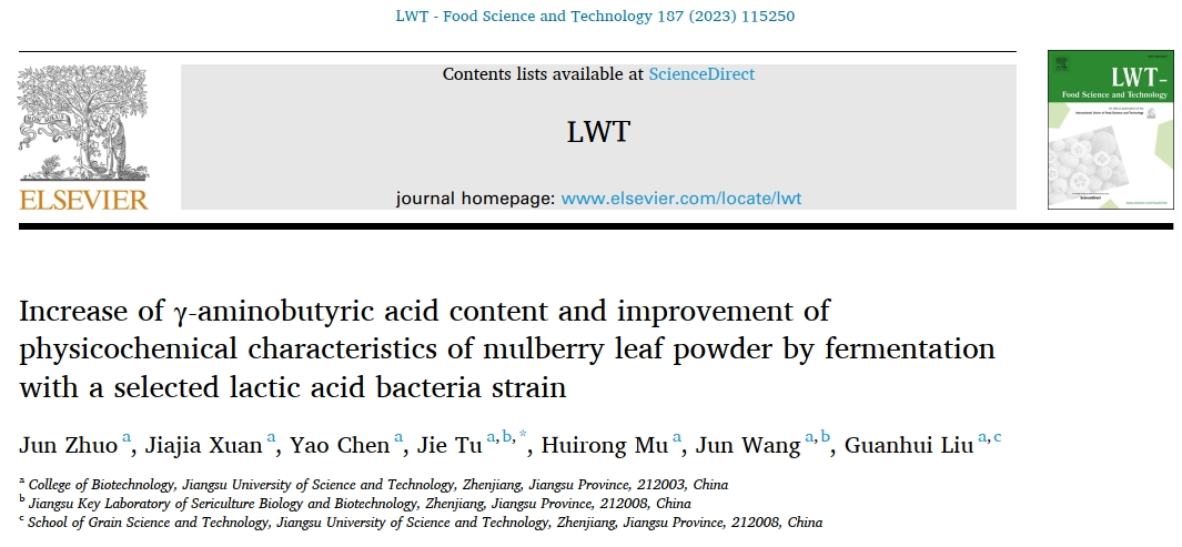 近日,江蘇科技大學(xué)生物技術(shù)學(xué)院屠潔副教授課題組在桑葉活性成分γ-氨基丁酸(γ-aminobutyric acid,GABA)定向富集及同步改善桑葉粉食用特性研究中取得創(chuàng)新進展,相關(guān)成果發(fā)表在農(nóng)林科學(xué)TOP期刊LWT-Food Science and Technology上。該論文第一作者是我院20級碩士研究生卓俊,通訊作者為屠潔副教授。LWT-Food Science and Technology是中科院一區(qū)期刊,目前最新影響因子6.0。