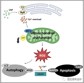 氯蟲苯甲酰胺雙稱康寬,是廣泛應(yīng)用于農(nóng)林害蟲防治的新型殺蟲劑,通過高效激活昆蟲魚尼丁受體,過度釋放細胞內(nèi)鈣庫中的鈣離子,導致昆蟲癱瘓死亡。家蠶食下帶有微量氯蟲苯甲酰胺的桑葉,不會表現(xiàn)中毒癥狀,但可以引起家蠶結(jié)薄皮繭,影響蠶繭的產(chǎn)量和質(zhì)量。為了闡明這一作用機制,本團隊組織研究團隊進行攻關(guān),發(fā)現(xiàn)家蠶食下微量(0.01mg/L)氯蟲苯甲酰胺后,絲腺中的鈣離子穩(wěn)態(tài)被打破,胞內(nèi)鈣離子顯著增加。導致絲腺細胞的自噬和凋亡水平都增加;另外,鈣離子水平增加引起了鈣蛋白酶表達上升,將BmATG5切割為BmNtATG5,引起了自噬向凋亡的轉(zhuǎn)化,最終導致絲蛋白的合成的關(guān)鍵基因及其轉(zhuǎn)錄因子均下調(diào)表達。該研究結(jié)果揭示了鈣離子穩(wěn)態(tài)失衡是引起家蠶結(jié)薄皮繭的作用機制,另外也為氯蟲苯甲酰胺環(huán)境殘留的安全性評價提供了新的證據(jù)。