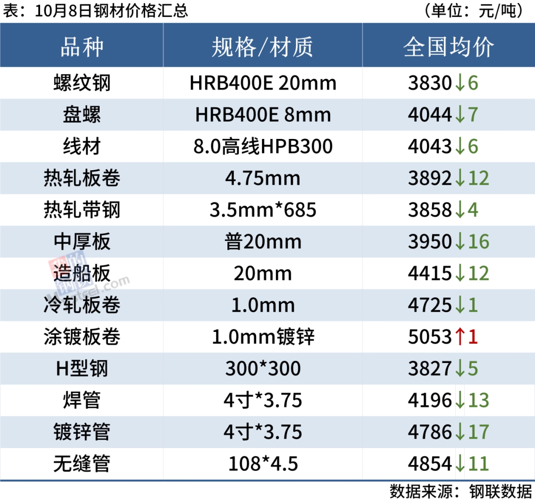 螺紋鋼(3653, -47.00, -1.27%):10月8日,全國31個主要城市20mm三級抗震螺紋鋼均價3830元/噸,較上個交易日跌6元/噸。市場需求低迷,避險情緒增加,因此預(yù)計9日國內(nèi)建筑鋼材價格或?qū)⒀永m(xù)弱勢運行態(tài)勢。