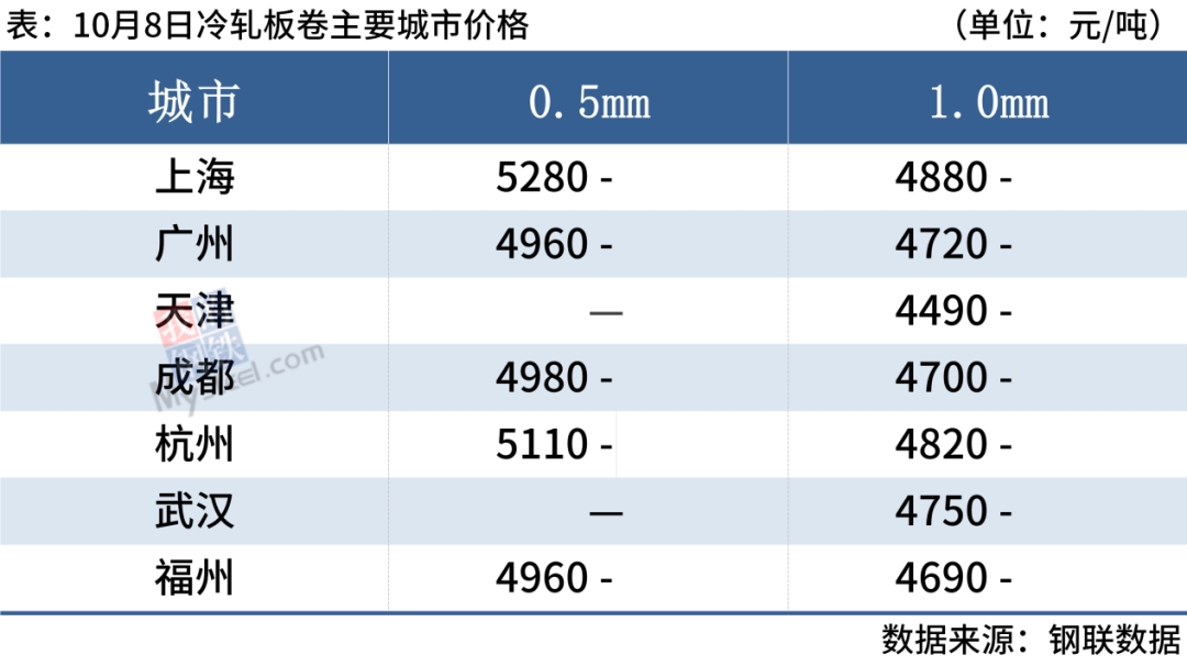 冷軋板卷:10月8日,全國24個主要城市1.0mm冷卷均價4725元/噸,較上個交易日下跌1元/噸。據(jù)市場商家反饋,節(jié)前訂貨資源少量到庫,部分規(guī)格還是暫缺,目前市場上冷軋現(xiàn)貨資源依舊偏緊。心態(tài)方面,大部分商家對于節(jié)后市場持謹(jǐn)慎觀望態(tài)度,操作上以快進(jìn)快出,回籠資金為主。綜合來看,預(yù)計9日全國冷軋板卷現(xiàn)貨價格或繼續(xù)窄幅震蕩為主。