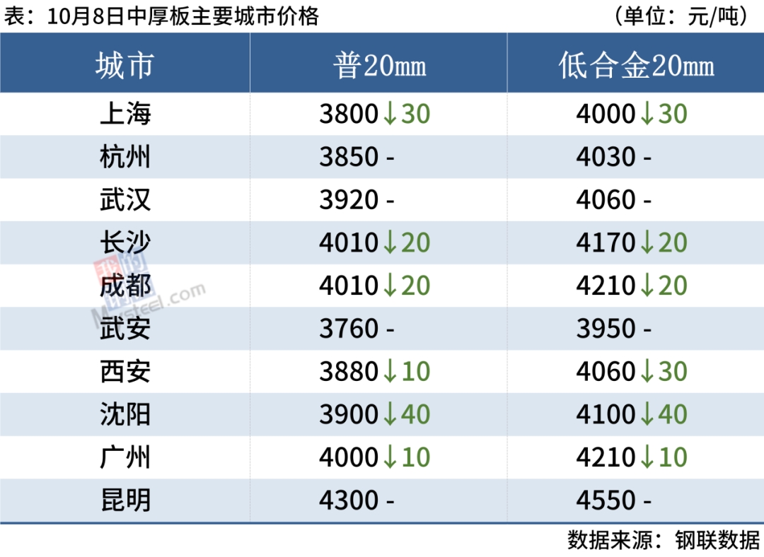 中厚板:10月8日,全國24個主要城市20mm普板均價3950元/噸,較上個交易日下跌16元/噸。雙節(jié)期間中板現(xiàn)貨庫存不斷增量,雖下游采購表現(xiàn)尚可,但貿(mào)易商對后市信心不足,操作方面多積極出貨為主,資源報價讓價空間較大。鋼廠方面,市場高供給狀態(tài)維持,部分鋼廠接單價格不斷下調(diào),但市場整體訂單積極性不高,需求釋放乏力。綜合來看,商戶對下游需求的可持續(xù)性預(yù)期不高,現(xiàn)貨價格支撐不足,看跌情緒較濃,預(yù)計9日全國中厚板價格弱穩(wěn)運行。