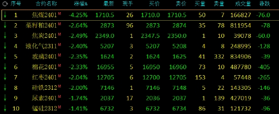 午盤收盤,國內(nèi)期貨主力合約多數(shù)下跌,雙焦期貨午后跳水,焦煤(1721, -12.00, -0.69%)跌超4%,焦炭(2362, -3.00, -0.13%)、菜粕、液化石油氣(LPG)、棉花(16870, -175.00, -1.03%)、玻璃(1632, -4.00, -0.24%)、紅棗(12865, 155.00, 1.22%)跌超2%,尿素跌近2%。漲幅方面,20號膠(NR)漲超2%,碳酸鋰、橡膠(14535, 375.00, 2.65%)、氧化鋁漲近2%。
