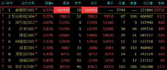 午盤收盤,國(guó)內(nèi)期貨主力合約漲多跌少,碳酸鋰封漲停,漲幅6.97%,集運(yùn)指數(shù)(歐線)漲超5%,20號(hào)膠(NR)漲超4%,橡膠(14660, 100.00, 0.69%)、紅棗(13195, 485.00, 3.82%)漲超3%,丁二烯橡膠(BR)、尿素漲超2%,菜油、燒堿、鐵礦(833, 3.00, 0.36%)、不銹鋼(SS)漲近2%。跌幅方面,液化石油氣(LPG)跌近3%,硅鐵(7128, -98.00, -1.36%)、PTA(5756, -38.00, -0.66%)、SC原油跌超1%。
