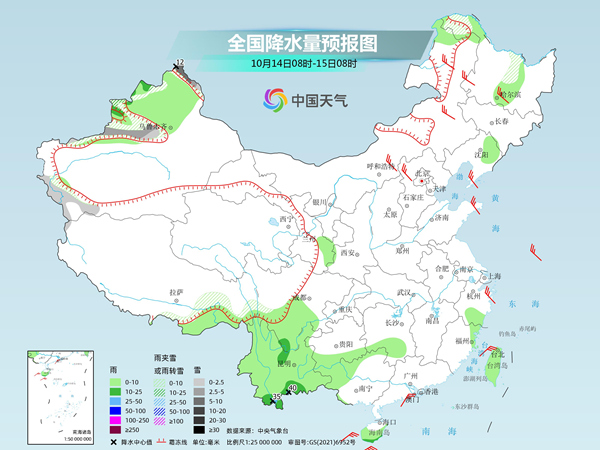 后天,新疆南疆盆地和北部阿勒泰高海拔地區(qū)、西藏北部和東部、青海西部等地部分地區(qū)有小到中雪或雨夾雪,其中,新疆北疆阿勒泰高海拔部分地區(qū)有大到暴雪(10~15毫米)。新疆北疆盆地、西藏東南部、四川中西部、云南、黑龍江東部、吉林東部、海南島、臺(tái)灣島等地部分地區(qū)有小到中雨,其中,海南島南部等地局部地區(qū)有大雨(25~40毫米)。