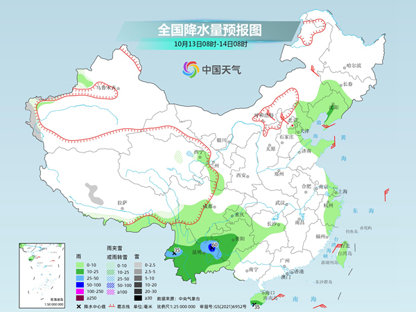具體來(lái)看,中央氣象臺(tái)預(yù)計(jì),今天新疆西部沿山地區(qū)、西藏南部、青海東部等地部分地區(qū)有小到中雪或雨夾雪。云南大部、四川南部、貴州中西部、廣西西北部、遼寧中部、海南島南部等地部分地區(qū)有中到大雨,其中,云南東北部局部地區(qū)有暴雨(50~60毫米)。