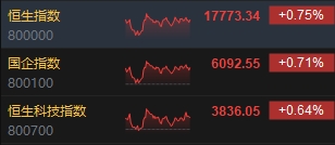 10月17日消息,港股三大指數(shù)收漲,截至收盤,恒生指數(shù)(17773.34, 132.98, 0.75%)漲0.75%,報17773.34點,恒生科技指數(shù)(3836.05, 24.37, 0.64%)漲0.64%,國企指數(shù)漲0.71%。盤面上,核心科技股多數(shù)上漲,小米集團(tuán)漲超3%,京東集團(tuán)漲超2%、阿里巴巴、網(wǎng)易、騰訊控股(302.2, 1.00, 0.33%)跟漲;汽車股漲跌不一,恒大汽車(0.61, 0.17, 38.64%)漲超38%,小鵬汽車跌超3%;金屬板塊漲幅靠前,天齊鋰業(yè)(42.95, 2.45, 6.05%)漲超6%;中資券商股普漲,國聯(lián)證券(3.54, 0.12, 3.51%)漲超3%;半導(dǎo)體概念股漲勢活躍,華虹半導(dǎo)體(19.68, 0.56, 2.93%)漲近3%;蘋果概念股集體下挫,通達(dá)集團(tuán)(0.103, -0.01, -5.50%)跌超5%。