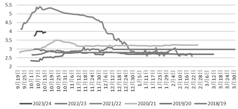 美國方面,2023/2024年度產(chǎn)量下調(diào)6.8萬噸,盡管其他地區(qū)產(chǎn)量增加,但得州干旱延續(xù)。截至10月3日,德州干旱程度和覆蓋率指數(shù)為285,同比高66,比上周減3,因此得州棉花產(chǎn)量繼續(xù)下調(diào)。出口量調(diào)減2.2萬噸,整體影響中性偏多。