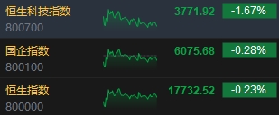 10月18日消息,港股三大指數(shù)齊跌,截至收盤,恒生指數(shù)(17732.52, -40.82, -0.23%)跌0.23%,報17732.52點,恒生科技指數(shù)(3771.92, -64.13, -1.67%)跌1.67%,國企指數(shù)跌0.28%。盤面上,核心科技股下挫,快手跌近9%,百度集團跌近5%,京東集團跌超3%;汽車股部分上漲,比亞迪漲近7%;體育用品股漲幅居前,安踏體育(94.25, 3.30, 3.63%)漲近4%;醫(yī)藥板塊表現(xiàn)萎靡,三葉草生物跌超10%;半導(dǎo)體、石油、蘋果概念等板塊飄紅。