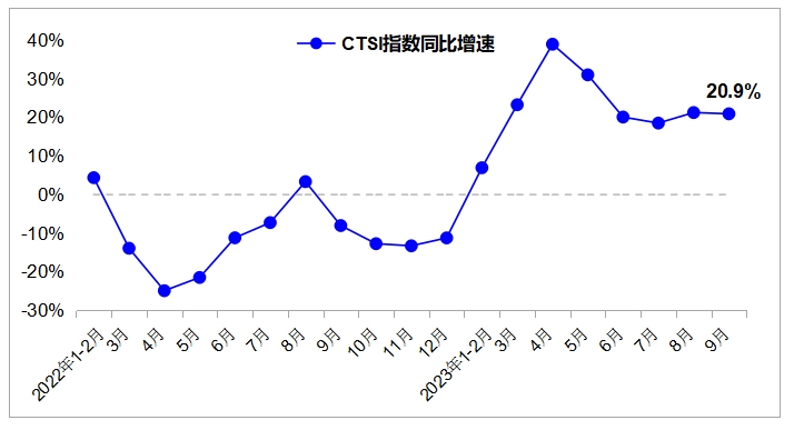 數(shù)據(jù)顯示,2023年9月,中國(guó)運(yùn)輸生產(chǎn)指數(shù)(CTSI)為177.5點(diǎn),同比增長(zhǎng)20.9%。分結(jié)構(gòu)看,CTSI貨運(yùn)指數(shù)為209.4點(diǎn),同比增長(zhǎng)8.2%;CTSI客運(yùn)指數(shù)為114.2點(diǎn),同比增長(zhǎng)89.4%。