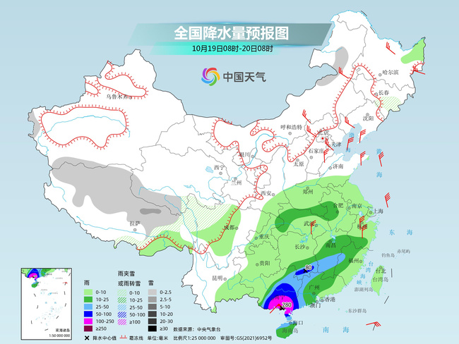 受臺風(fēng)和冷空氣共同影響,未來三天(10月19日至21日),華南部分地區(qū)強(qiáng)降雨連連,廣東、廣西等局地有特大暴雨,需防范連續(xù)強(qiáng)降雨可能引發(fā)的次生災(zāi)害。氣溫方面,隨著冷空氣繼續(xù)東移南下,中東部氣溫將大面積刷新立秋后的新低,南方冷暖轉(zhuǎn)換明顯,公眾請及時調(diào)整著裝,謹(jǐn)防感冒。