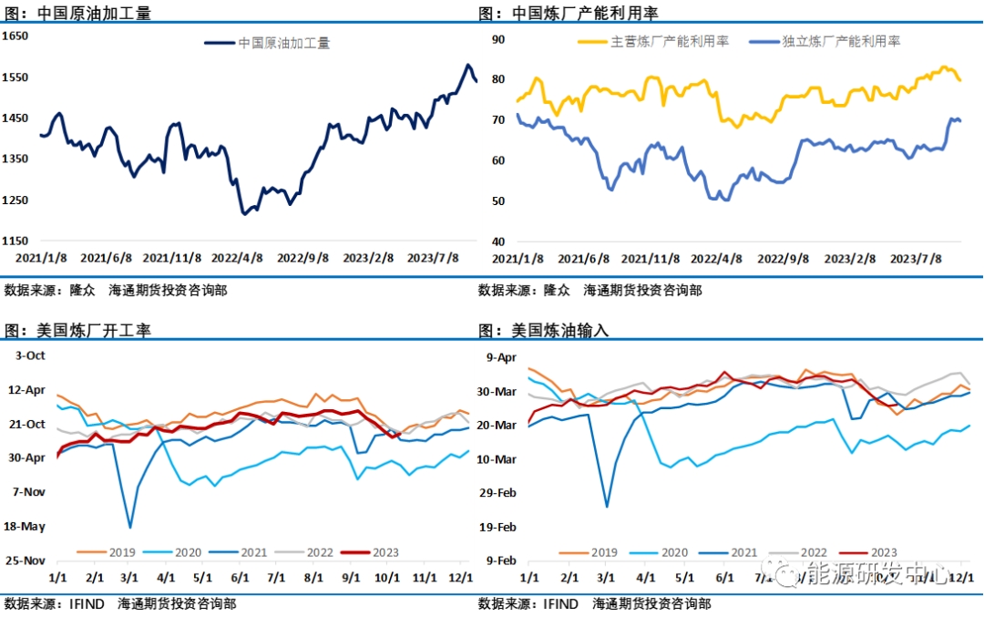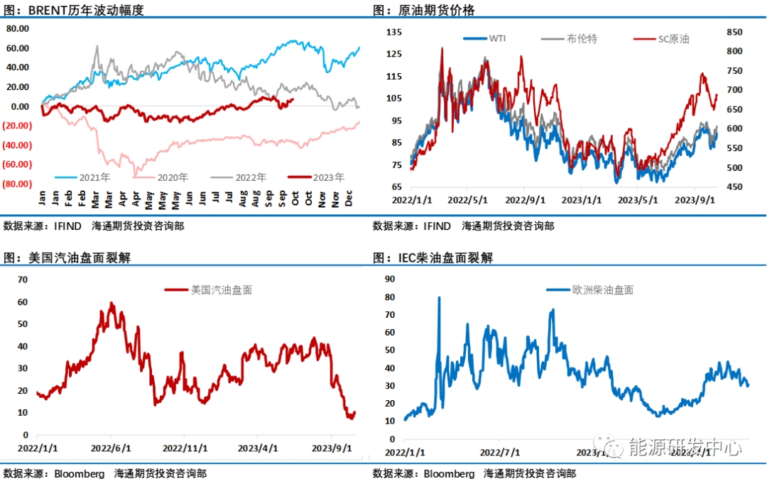 因巴以沖突的影響,投資者注意力都集中在了供應(yīng)端的變化,事實上10月初油價暴跌之際,需求端的疲弱反應(yīng)還是值得投資者關(guān)注,目前全球各地區(qū)汽油裂解差均處于低位,一直因供應(yīng)緊張而表現(xiàn)抗跌的歐洲柴油裂解差近期也有走弱跡象,上周三大機(jī)構(gòu)均不同程度對需求端預(yù)期有所下調(diào),高油價對需求的抑制已經(jīng)在9月有所體現(xiàn),2024年需求增速下降將是大概率事件。短期內(nèi)油價雖然因地緣因素沖高,但后續(xù)持續(xù)性如果沒有需求端的配合,預(yù)計也很難維持高位。一旦地緣風(fēng)險降溫,投資者注意力重新回到原油市場供需層面,油價預(yù)計難以保持當(dāng)前的強(qiáng)勢格局。