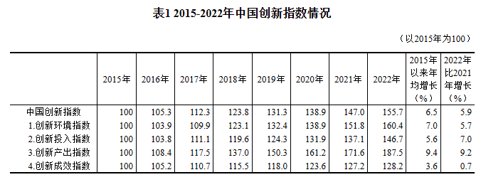測(cè)算結(jié)果顯示,以2015年為基期,2022年中國(guó)創(chuàng)新指數(shù)為155.7,4個(gè)分領(lǐng)域指數(shù)創(chuàng)新環(huán)境指數(shù)、創(chuàng)新投入指數(shù)、創(chuàng)新產(chǎn)出指數(shù)和創(chuàng)新成效指數(shù)分別為160.4、146.7、187.5和128.2。與2015年相比,中國(guó)創(chuàng)新指數(shù)年均增長(zhǎng)6.5%,比同期國(guó)內(nèi)生產(chǎn)總值(GDP)增速快0.8個(gè)百分點(diǎn);4個(gè)分領(lǐng)域指數(shù)年均增速分別為7.0%、5.6%、9.4%和3.6%。與2021年相比,中國(guó)創(chuàng)新指數(shù)增長(zhǎng)5.9%,4個(gè)分領(lǐng)域指數(shù)分別增長(zhǎng)5.7%、7.0%、9.2%和0.7%(詳見(jiàn)表1)。