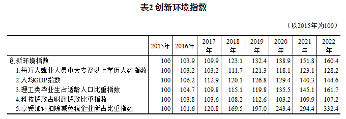 以2015年為100,2022年我國(guó)創(chuàng)新環(huán)境指數(shù)為160.4,年均增長(zhǎng)7.0%。分指標(biāo)看,享受加計(jì)扣除減免稅企業(yè)所占比重指數(shù)大幅提升,年均增速達(dá)18.7%,2022年指數(shù)值達(dá)332.4,在中國(guó)創(chuàng)新指數(shù)的全部18個(gè)指標(biāo)中位列第一;理工類(lèi)畢業(yè)生占適齡人口比重指數(shù)、人均GDP指數(shù)、每萬(wàn)人就業(yè)人員中大專(zhuān)及以上學(xué)歷人數(shù)指數(shù)、科技撥款占財(cái)政撥款比重指數(shù)的年均增速分別為7.1%、5.4%、3.6%和1.0%,2022年指數(shù)值相應(yīng)為161.7、144.6、128.2和107.2(詳見(jiàn)表2)。