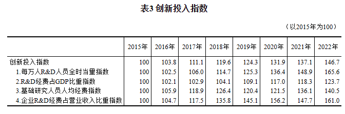 以2015年為100,2022年我國(guó)創(chuàng)新投入指數(shù)為146.7,年均增長(zhǎng)5.6%。分指標(biāo)看,每萬(wàn)人R&D人員全時(shí)當(dāng)量指數(shù)增長(zhǎng)相對(duì)較快,年均增速為7.5%,2022年指數(shù)值為165.6;企業(yè)R&D經(jīng)費(fèi)占營(yíng)業(yè)收入比重指數(shù)、基礎(chǔ)研究人員人均經(jīng)費(fèi)指數(shù)、R&D經(jīng)費(fèi)占GDP比重指數(shù)的年均增速分別為7.0%、5.0%和3.1%,2022年指數(shù)值相應(yīng)為161.0、140.5和123.7(詳見(jiàn)表3)。