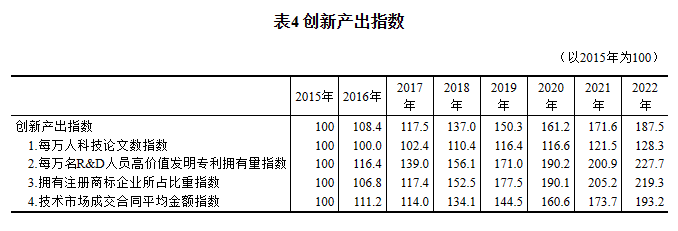 以2015年為100,2022年我國(guó)創(chuàng)新產(chǎn)出指數(shù)為187.5,年均增長(zhǎng)9.4%。分指標(biāo)看,每萬(wàn)名R&D人員高價(jià)值發(fā)明專(zhuān)利擁有量指數(shù)、擁有注冊(cè)商標(biāo)企業(yè)所占比重指數(shù)實(shí)現(xiàn)大幅提升,年均增速分別達(dá)12.5%和11.9%,2022年指數(shù)值分別為227.7和219.3,在全部18個(gè)指標(biāo)中位列第二和第三;技術(shù)市場(chǎng)成交合同平均金額指數(shù)增長(zhǎng)也較快,年均增速為9.9%,2022年指數(shù)值為193.2;每萬(wàn)人科技論文數(shù)指數(shù)年均增速為3.6%,2022年指數(shù)值為128.3(詳見(jiàn)表4)。