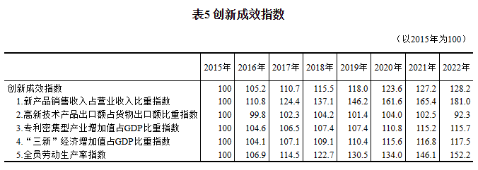 以2015年為100,2022年我國(guó)創(chuàng)新成效指數(shù)為128.2,年均增長(zhǎng)3.6%。分指標(biāo)看,新產(chǎn)品銷(xiāo)售收入占營(yíng)業(yè)收入比重指數(shù)增長(zhǎng)相對(duì)較快,年均增速為8.8%,2022年指數(shù)值為181.0;全員勞動(dòng)生產(chǎn)率指數(shù)、“三新”經(jīng)濟(jì)增加值占GDP比重指數(shù)、專(zhuān)利密集型產(chǎn)業(yè)增加值占GDP比重指數(shù)、高新技術(shù)產(chǎn)品出口額占貨物出口額比重指數(shù)的年均增速分別為6.2%、2.3%、2.1%和-1.1%,2022年指數(shù)值相應(yīng)為152.2、117.5、115.7和92.3(詳見(jiàn)表5)。