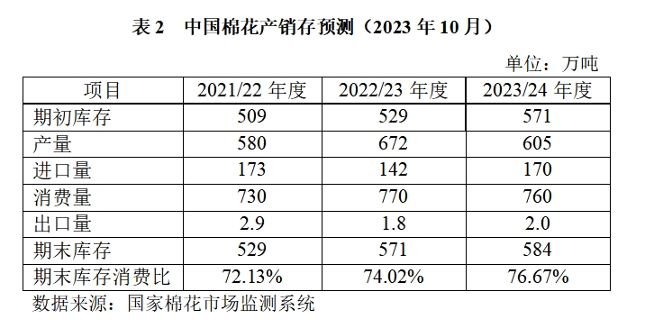 基于相關專題調(diào)查和對國內(nèi)外經(jīng)濟環(huán)境及市場狀況的分析,本期國家棉花市場監(jiān)測系統(tǒng)對2023年度中國棉花產(chǎn)銷存預測如下: