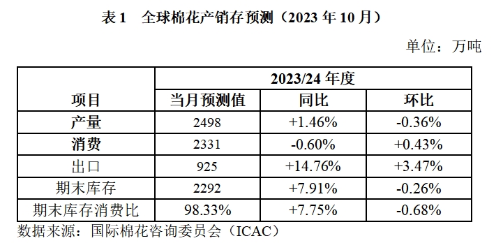 據(jù)國際棉花咨詢委員會(ICAC)10月數(shù)據(jù)預測,2023/24年度全球棉花產(chǎn)量2498萬噸,較上月調(diào)減9萬噸,減幅0.36%,同比增加36萬噸,增幅1.46%;消費量2331萬噸,較上月調(diào)增10萬噸,增幅0.43%,同比減少14萬噸,減幅0.60%;供求關系由上年度的產(chǎn)大于需117萬噸擴大為本年度的167萬噸。期末庫存消費比98.33%,較上月下降0.68個百分點,同比上升7.75個百分點。