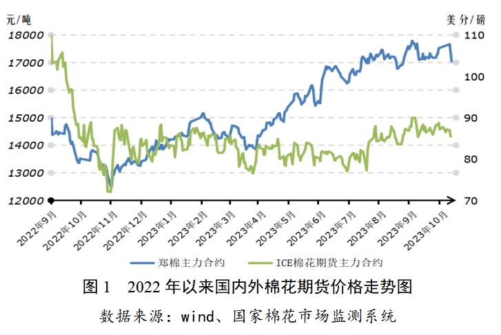 9月中旬以來,美聯(lián)儲雖維持9月利率不變,但暗示年內(nèi)可能繼續(xù)加息,銀行業(yè)流動性風險加劇。俄烏沖突持續(xù)疊加巴以沖突升級,全球經(jīng)濟不確定性進一步增加。北半球新棉供應在即,全球紡織市場需求不振,國際棉價偏弱震蕩。截至2023年10月19日,ICE棉花期貨主力合約結(jié)算價84.27美分/磅,較上月中旬下跌2.51%;代表進口棉中國主港到岸均價的國際棉花指數(shù)(M)96.08美分/磅,折人民幣進口成本16727元/噸(關稅1%、增值稅9%,無港雜費),較上月中旬下跌2.97%。