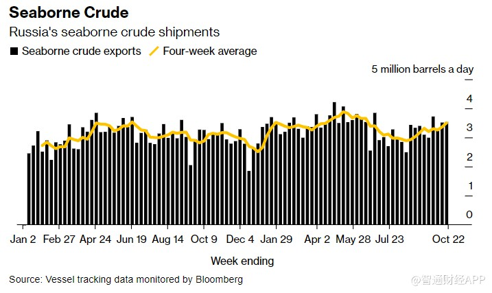 俄羅斯的石油出口量正在穩(wěn)步攀升。油輪跟蹤數(shù)據(jù)顯示,在截至10月22日的一周內(nèi),每天約有353萬(wàn)桶原油從俄羅斯港口運(yùn)出,比前七天增加2萬(wàn)桶/日。受此影響,波動(dòng)性較小的四周平均值升至350萬(wàn)桶/日,為6月以來(lái)的最高水平,在過(guò)去兩個(gè)月里,出口量增加了約61萬(wàn)桶/日。