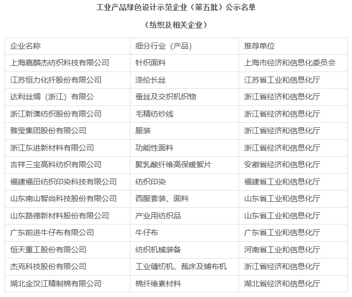 日前,工業(yè)和信息化部發(fā)布工業(yè)產(chǎn)品綠色設計示范企業(yè)(第五批)名單公示,共有107家企業(yè)上榜,其中十余家紡織企業(yè)入圍。