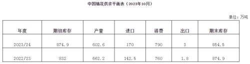 9月,全國(guó)棉花采摘、交售工作逐步展開(kāi),受新疆棉花生育期偏晚影響,采摘和交售進(jìn)度均慢于去年,月底大范圍收購(gòu)還未開(kāi)始,新疆以手摘棉為主,機(jī)采棉僅有少量采收,收購(gòu)價(jià)格高于去年。紡織市場(chǎng)旺季不及預(yù)期,同時(shí)國(guó)內(nèi)棉花市場(chǎng)供應(yīng)充足,滑準(zhǔn)稅配額逐漸下發(fā)至紡織企業(yè),儲(chǔ)備棉銷售有序進(jìn)行,國(guó)內(nèi)棉價(jià)沖高回落,走勢(shì)弱于國(guó)際,內(nèi)外棉價(jià)差縮小。據(jù)中國(guó)棉花協(xié)會(huì)預(yù)計(jì),2023/24年度我國(guó)棉花產(chǎn)量602.6萬(wàn)噸,同比下降9%,較上期下調(diào)25.3萬(wàn)噸;消費(fèi)量、進(jìn)口量和出口未做調(diào)整,分別為790萬(wàn)噸、170萬(wàn)噸和3萬(wàn)噸;期末庫(kù)存相應(yīng)調(diào)整為854.5萬(wàn)噸,同比下降2.3%。