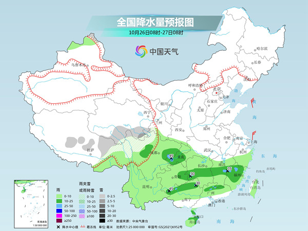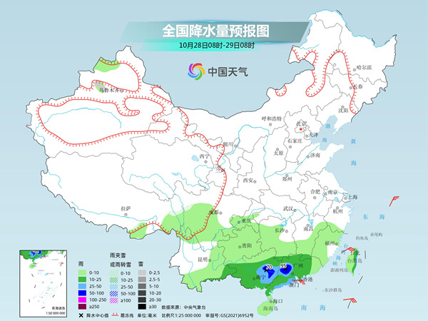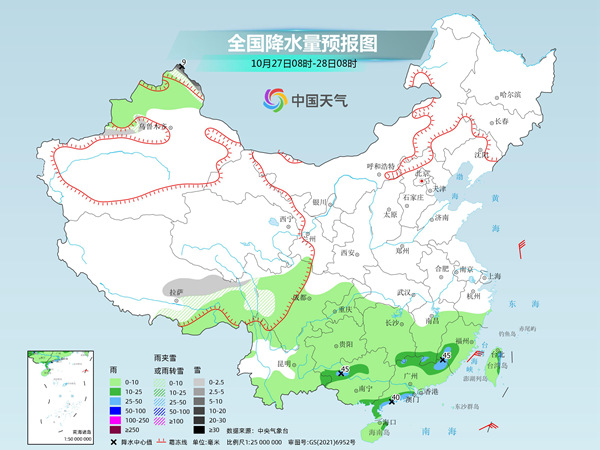 明天開(kāi)始,降雨的重心將逐漸向華南轉(zhuǎn)移。預(yù)計(jì)新疆北疆北部、西藏東部等地部分地區(qū)有小到中雪或雨夾雪,局地大雪。西南地區(qū)大部、江南大部、華南等地有小到中雨,局地大雨。