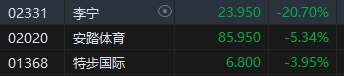 體育用品股大跌,李寧績后跌近21%。消息面上,李寧昨晚公布2023年第三季度最新運(yùn)營狀況公告:李寧銷售點(diǎn)(不包括李寧YOUNG)于整個(gè)平臺之零售流水按年錄得中單位數(shù)增長。就渠道而言,線下渠道(包括零售及批發(fā))錄得高單位數(shù)增長,其中零售(直接經(jīng)營)渠道錄得20%-30%低段增長及批發(fā)(特許經(jīng)銷商)渠道錄得低單位數(shù)增長;電子商務(wù)虛擬店鋪業(yè)務(wù)錄得低單位數(shù)下降。