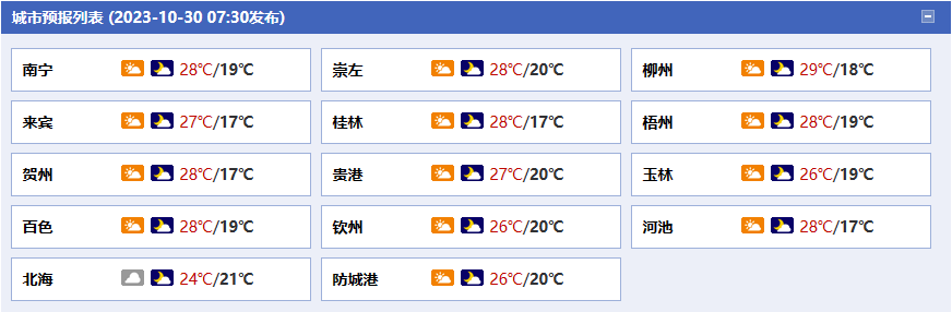 今天白天,全區(qū)多云到晴,其中北海、玉林、南寧等市局地有小雨。