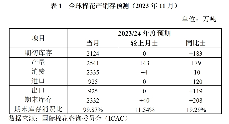 2023年11月,國際棉花咨詢委員會(ICAC)發(fā)布的數據顯示,2023/24年度全球棉花期初庫存2124萬噸,環(huán)比持平,同比增加183萬噸;產量2541萬噸,環(huán)比增加43萬噸,同比增加79萬噸;消費2335萬噸,環(huán)比增加4萬噸,同比減少10萬噸;期末庫存2332萬噸,環(huán)比增加40萬噸,同比增加208萬噸;期末庫存消費比99.87%,環(huán)比上升1.54個百分點,同比上升9.29個百分點。