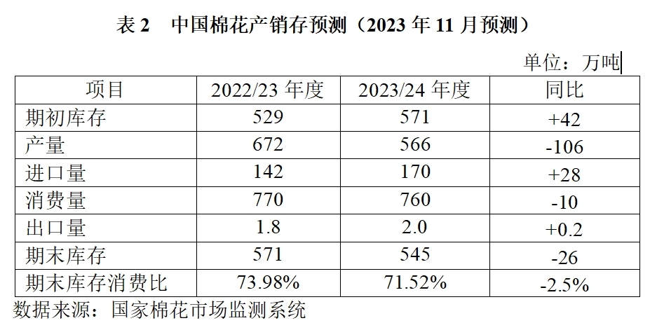 2023/24年度中國棉花期初庫存為571萬噸,同比增長8.1%;產量調整為566萬噸,同比下降15.8%;進口量170萬噸,同比增長19.7%;消費量760萬噸,同比下降1.3%;供求關系由上年度的供不足需98萬噸擴大為本年度的194萬噸;出口量2.0萬噸,同比增長11.1%;期末庫存調整為545萬噸,同比減少4.6%;庫存消費比為71.71%,較上年度下降2.3個百分點。