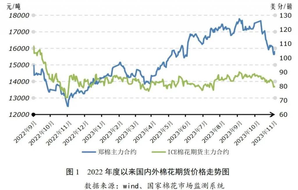 10月中旬以來,國內棉農惜售心理松動,籽棉收購僵持局面逐漸被打破,新棉加工上市進度大幅加快,而下游紡織市場轉弱跡象明顯,棉紗貿易商低價拋售增多,棉花期現貨價格快速下跌。受制于需求支撐不足,儲備棉銷售停止后,棉花價格未出現反彈。截至2023年11月22日,鄭州商品交易所棉花期貨主力合約結算價為15380元/噸,環(huán)比下跌5.7%;代表內地標準級皮棉市場價格的國家棉花價格B指數為16601元/噸,環(huán)比下跌6.1%。